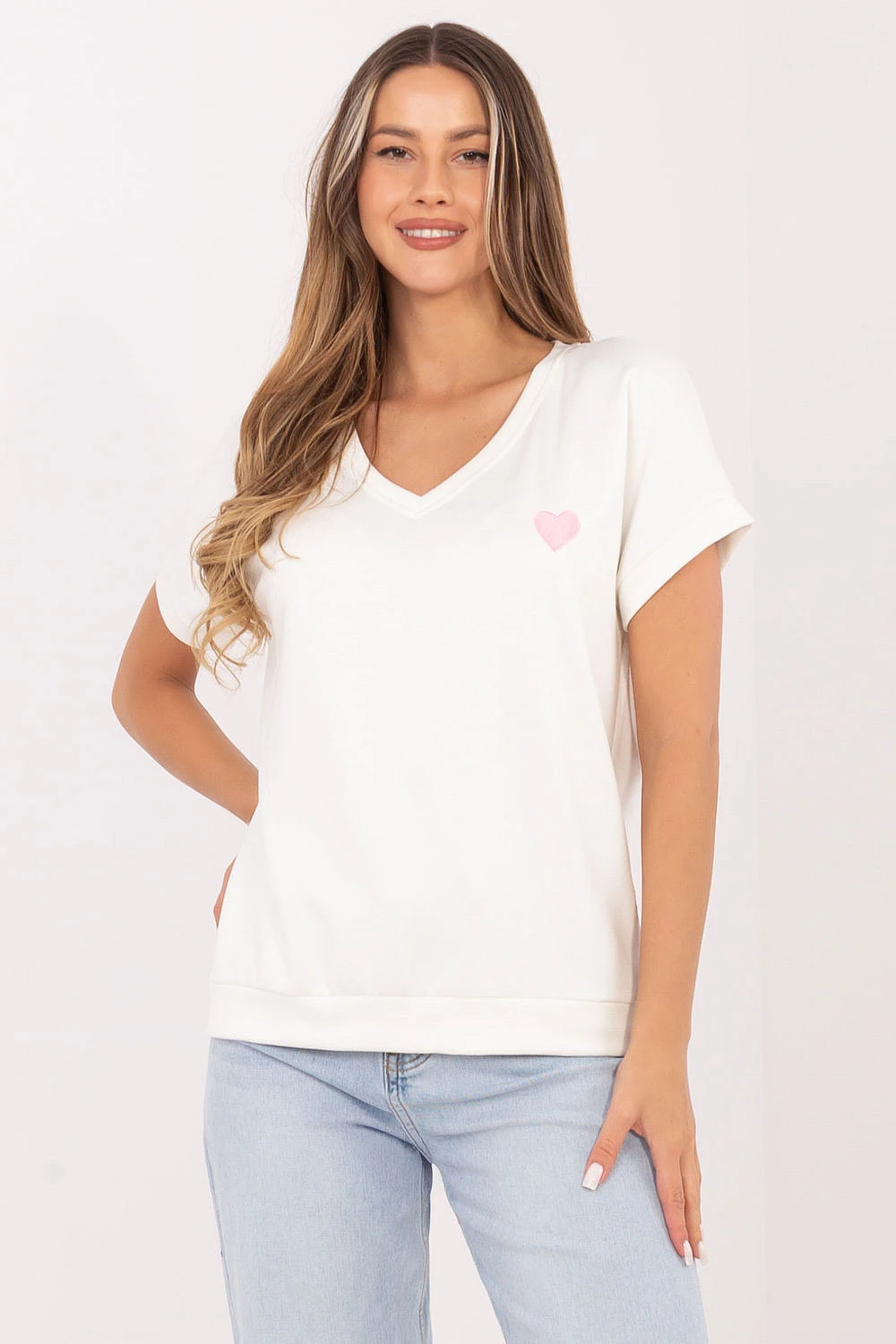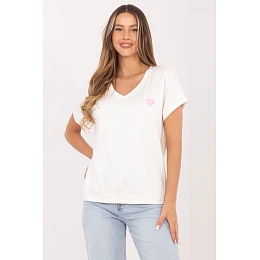 Dámská blůzka v oversize střihu je vynikající volbou pro ženy, které si cení pohodlí a volného, casual stylu. Volný střih zajišťuje komfort nošení a módní, nenáročný vzhled, ideální pro každodenní stylizace. Model vyrobený z měkké a elastické směsi viskózy a elastanu je příjemný na dotek, lehce se přizpůsobuje siluetě a zaručuje plnou volnost pohybu. Standardní délka dělá z blůzky skvělý kousek jak k kalhotám, tak ke skrtům. Výstřih do tvaru V opticky prodlužuje krk a dodává celku lehkost, podtrhující ženský charakter střihu. Půvab dodává jemný detail v podobě vyšívaného srdíčka umístěného po levé straně ve výšce hrudníku, který dodává blůzce jedinečný a delikátní akcent. Je to ideální volba na den pro ženy, které hledají kombinaci pohodlí, jednoduchosti a módních detailů v casual provedení.