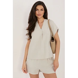 Elegantní a zároveň pohodlná dámská halenka je skvělou volbou pro každodenní outfit. Vyrobená z vysoce kvalitní směsi viskózy a polyamidu poskytuje lehkost, prodyšnost a pohodlí po celý den. Model se standardní délkou a krátkým rukávem je skvělým doplňkem pro teplejší dny, nabízí volnost pohybu a univerzální vzhled. Hladký materiál zdůrazňuje minimalistický charakter halenky, díky čemuž ji snadno sladíte s mnoha kousky šatníku. Na přední straně je ozdobný lem, který dodává celku decentní eleganci a odlišuje model od klasických střihů. Výstřih do V spojený se stojacím límcem přidává moderní a stylový akcent, krásně zdůrazňující krk. Halenka nemá zapínání, co zvyšuje pohodlí při nošení. Ideální na každý den do práce, na schůzky nebo procházky, skvěle ladí jak se kalhotami, tak s sukní.