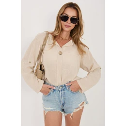 Halenní košile vyrobená z vysokokvalitní bavlny, která poskytuje pohodlí a prodyšnost po celý den. Model s hladkým vzorem činí košili univerzální a snadno kombinovatelnou s mnoha styly, jak do džín, tak do sukně. Košile má výstřih do V ozdobený jemným knoflíkem, který jí dodává jemný, ženský charakter. Standardní délka zajišťuje dobrou přiléhavost k postavě a umožňuje nosit ji různými způsoby. Model je vybaven dlouhými rukávy s možností zkrácení, díky čemuž je košile snadno přizpůsobitelná počasí a stylizaci. Bez zapínání je pohodlná a rychlá na oblékání, ideální na každodenní příležitosti.