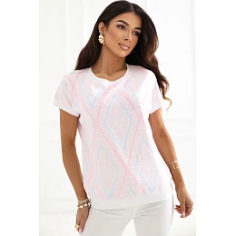 Dámský každodenní top je pohodlný a stylový návrh na různé příležitosti. Vyrobený z příjemné směsi bavlny a elastanu, poskytuje pohodlí nošení, dobrou prodyšnost a lehkou pružnost, díky které se přizpůsobuje postavě. Model se vyznačuje geometrickým vzorem, který mu dodává moderní a výrazný charakter. Standardní délka dělá top skvěle sladitelný jak s kalhotami, tak s sukněmi. Krátký rukáv a kulatý výstřih jemně zdůrazňují ženskou siluetu, přidávají lehkost celému outfitu. Bez zapínání zvyšuje pohodlí nošení a dělá model snadno nasaditelným. Univerzální top ideální na každý den, skvělý jak do práce, tak na méně formální události.