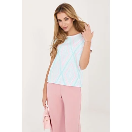 Dámský každodenní top je pohodlný a stylový návrh na různé příležitosti. Vyrobený z příjemné směsi bavlny a elastanu, poskytuje pohodlí nošení, dobré prodyšnost a lehkou pružnost, díky které se přizpůsobuje postavě. Model je zdoben geometrickým vzorem, který mu dodává moderní a výrazný charakter. Standardní délka dělá top skvělým doplňkem jak k kalhotám, tak k sukním. Krátký rukáv a kulatý výstřih jemně zdůrazňují ženskou siluetu, dodávají lehkost celému outfitu. Bez zapínání zvyšuje pohodlí nošení a dělá model snadný na oblékání. Univerzální top ideální na každý den, skvělý jak do práce, tak na méně formální události.