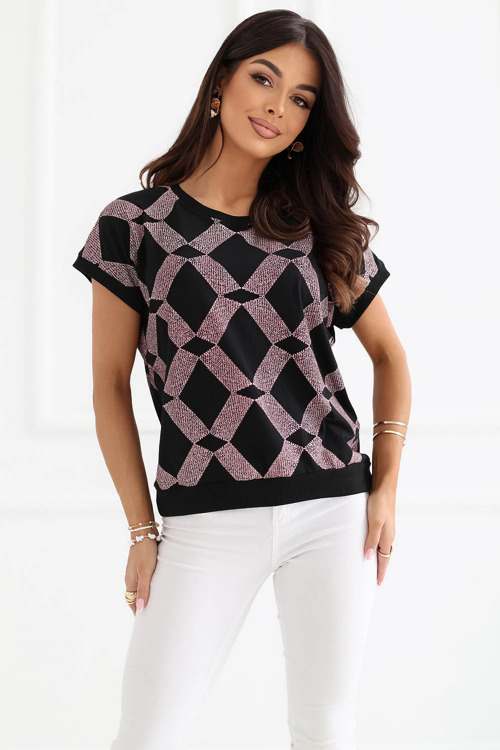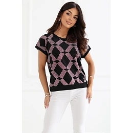 Dámský každodenní top je pohodlný a stylový návrh pro různé příležitosti. Vyrobený z příjemné směsi bavlny a elastanu, poskytuje pohodlí nošení, dobrou prodyšnost a lehkou pružnost, díky níž se přizpůsobuje postavě. Model je zdoben geometrickým vzorem, který mu dodává moderní a výrazný charakter. Standardní délka umožňuje skvěle kombinovat top jak s kalhotami, tak s sukněmi. Krátký rukáv a kulatý výstřih jemně zdůrazňují ženskou siluetu, dodávají lehkost celému outfitu. Bez zapínání zvyšuje pohodlí nošení a činí model snadným na oblékání. Univerzální top je ideální na každý den, skvěle se hodí jak do práce, tak na méně formální události.