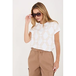 Dámský každodenní top je pohodlnou a stylovou volbou pro různé příležitosti. Vyrobený z příjemné směsi bavlny a elastanu, poskytuje pohodlí, dobré prodyšnost a lehkou pružnost, díky které se přizpůsobuje postavě. Model se vyznačuje geometrickým vzorem, který mu dodává moderní a výrazný charakter. Standardní délka dělá z topu skvělý doplněk jak k kalhotám, tak k sukním. Krátký rukáv a kulatý výstřih decentně zdůrazňují ženskou siluetu, přidávají lehkost celému outfitu. Bez zapínání zvyšuje pohodlí nošení a dělá z modelu snadný k oblékání. Jedná se o univerzální top ideální na každý den, skvělý jak do práce, tak na méně formální události.