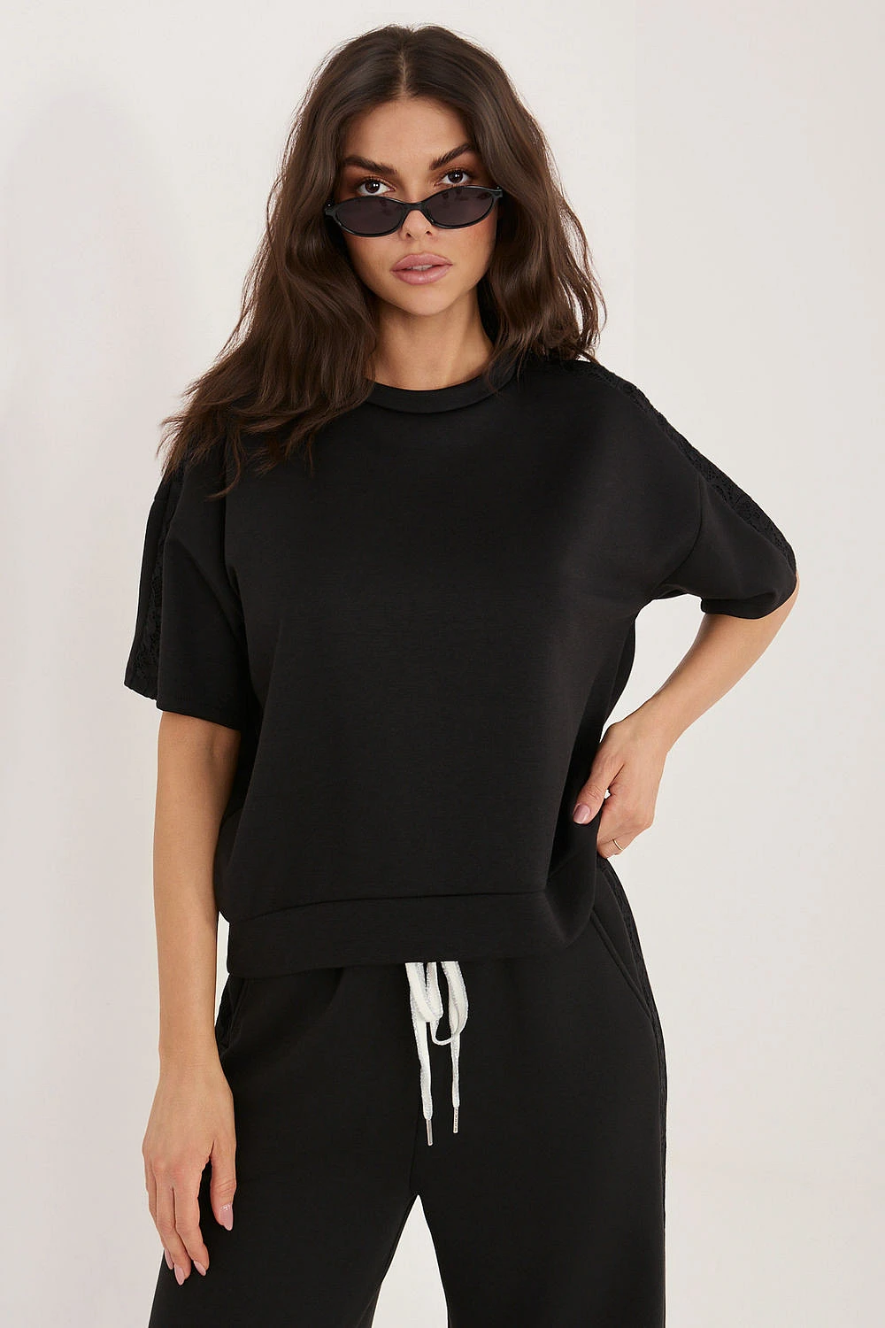 Dámský top s univerzálním charakterem je ideální volbou na každodenní nošení i do práce v méně formálním stylu. Jeho minimalistický, hladký design umožňuje snadné sladění s mnoha outfitovými styly, ať už s džínami, elegantními kalhoty nebo sukní. Model s klasickou délkou a krátkým rukávem poskytuje pohodlí a volnost pohybu, zatímco jemné krajkové pruhy na rukávech dodávají celkovému vzhledu jemný ženský akcent. Kulatý výstřih zdůrazňuje klasický charakter topu a zajišťuje, že vypadá uklizeně a nadčasově. Vyrobený z vysoké kvality směsi polyesteru, viskózy a elastanu, top je příjemný na dotek, elastický a dobře padne na postavě. Bez zapínání zvyšuje pohodlí nošení a dodává mu jednoduchý, moderní tvar. Jedná se o praktický a stylový kousek do šatníku, který se osvědčí v mnoha každodenních situacích.