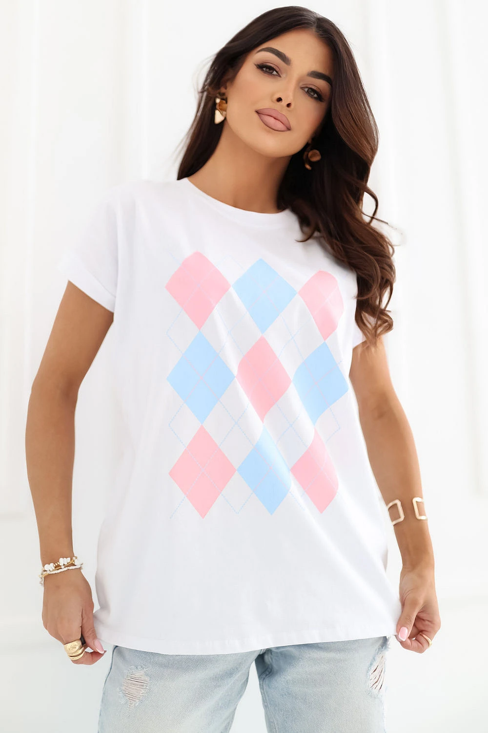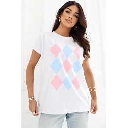 Dámský každodenní top je pohodlný a stylový návrh pro různé příležitosti. Vyrobený z příjemné směsi bavlny a elastanu, poskytuje pohodlí nošení, dobré prodyšnost a lehkou pružnost, díky které se přizpůsobuje postavě. Model se vyznačuje geometrickým vzorem, který mu dodává moderní a výrazný charakter. Standardní délka dělá top skvěle sladěný jak s kalhotami, tak s sukněmi. Krátký rukáv a kulatý výstřih jemně zdůrazňují ženskou siluetu, přidávají lehkost celému outfitu. Bez zapínání zvyšuje pohodlí nošení a dělá model snadno nasaditelným. Jedná se o univerzální top ideální na každý den, skvělý jak do práce, tak na méně formální výlety.
