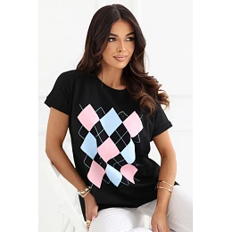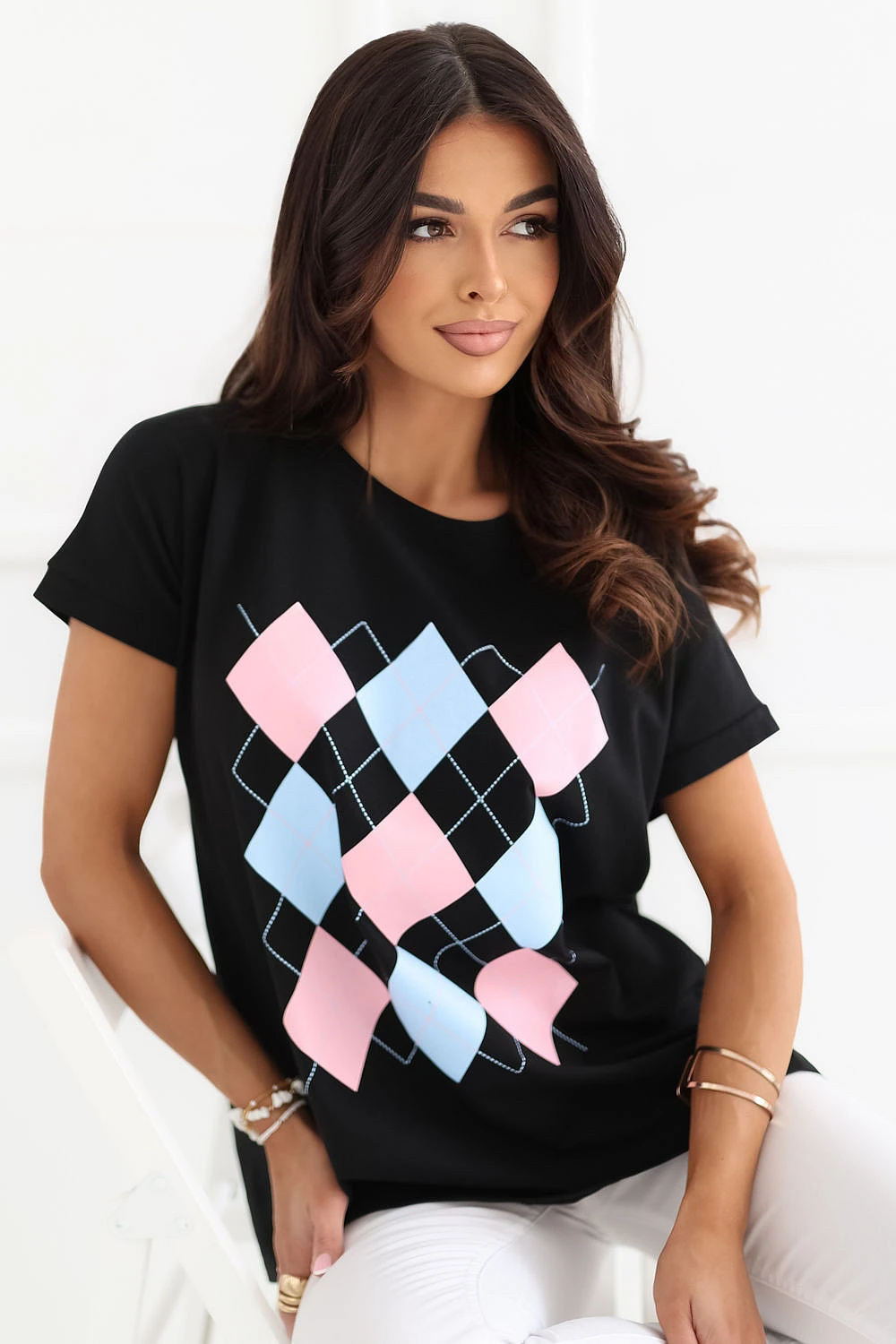 Košile s každodenním charakterem pro ženy je pohodlný a stylový návrh na různé příležitosti. Vyrobená z příjemné směsi bavlny a elastanu nabízí pohodlné nošení, dobrou prodyšnost a lehkou elasticitu, díky které se přizpůsobuje postavě. Model se vyznačuje geometrickým vzorem, který mu dodává moderní a výrazný charakter. Standardní délka dělá košili skvělým doplňkem jak k kalhotám, tak k sukním. Krátký rukáv a kulatý výstřih jemně zdůrazňují ženskou siluetu, dodávají lehkost celému outfitu. Absence zapínání zvyšuje pohodlí používání a dělá model snadným na nasazení. Univerzální košile ideální na každý den, skvělá jak do práce, tak na méně formální události.
