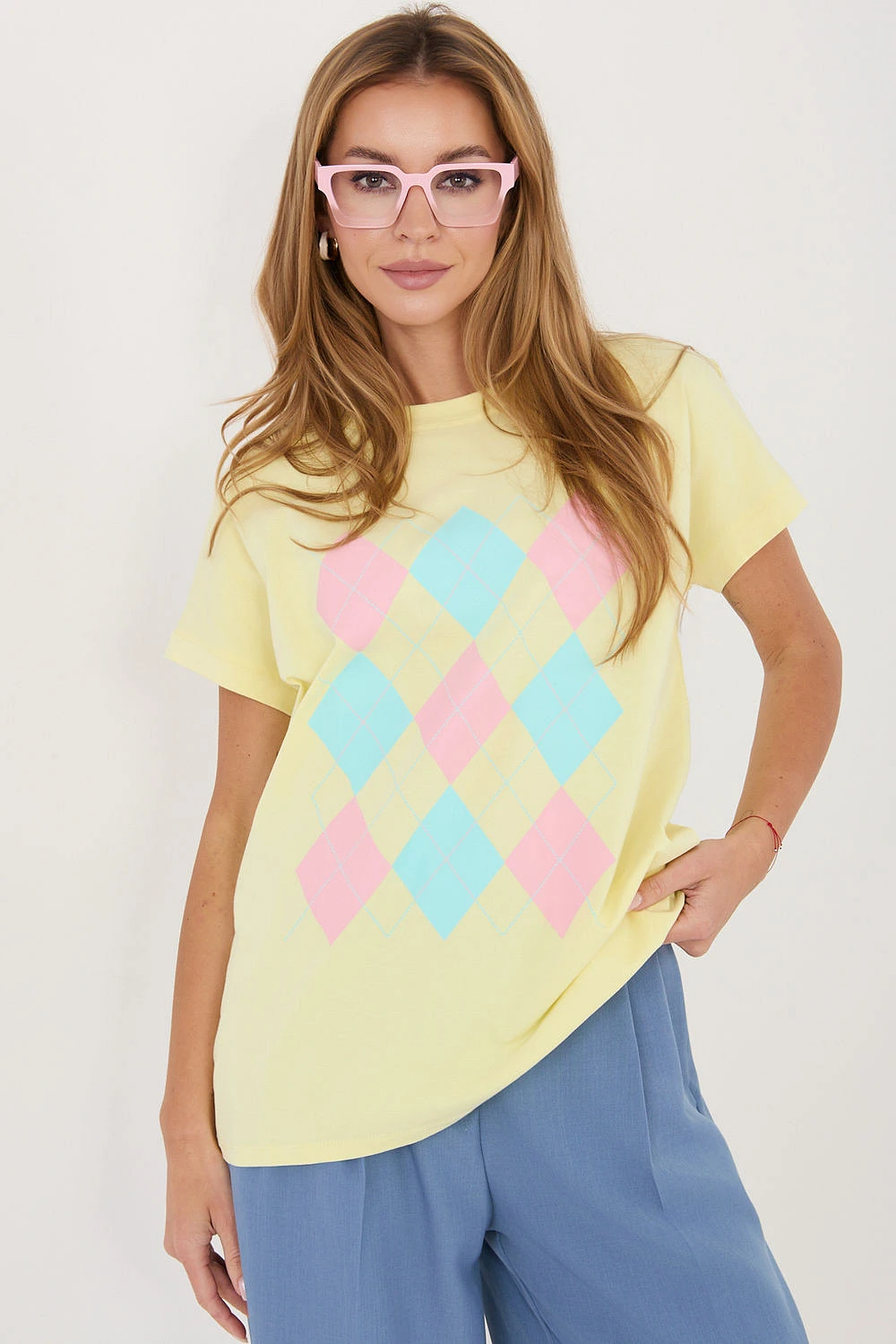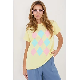 Dámský top s každodenním charakterem je pohodlný a stylový návrh na různé příležitosti. Vyrobena z příjemné směsi bavlny a elastanu, poskytuje pohodlí nošení, dobrou prodyšnost a lehkou pružnost, díky které se přizpůsobuje postavě. Model je zdoben geometrickým vzorem, který mu dodává moderní a výrazný charakter. Standardní délka dělá top skvěle sladěný jak s kalhotami, tak s sukněmi. Krátký rukáv a kulatý výstřih decentně zdůrazňují ženskou siluetu, přidávají lehkost celému outfitu. Bez zapínání zvyšuje pohodlí nošení a dělá model snadným na nasazení. Jedná se o univerzální top ideální na každý den, skvělý jak do práce, tak na méně formální události.