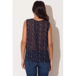 Jemná šifonová halenka s kulatým výstřihem bez rukávů. Halenka s krytým zipem. Halenka z jemně průhledné látky s ptáčky.