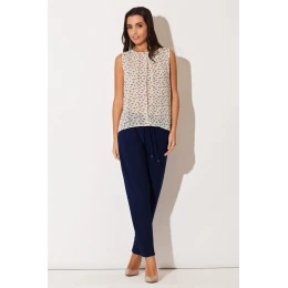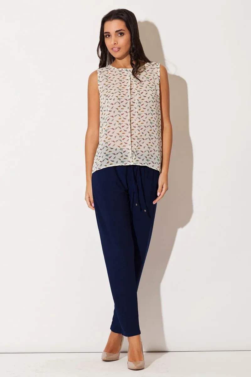 Subtilní, šifon halenka dámské kulatým výstřihem bez rukávů. Halenka upevněny na zip. Halenka z mírně průsvitného materiálu u ptáků.