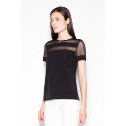 Elegantní halenka s krátkými rukávy a půlkulatým výstřihem. Ozdobné průhledné prvky ve výstřihu a na rukávech. Model vyrobený z kvalitního materiálu.