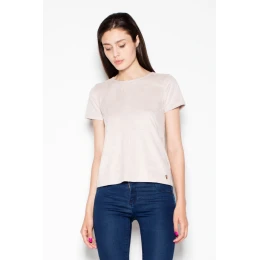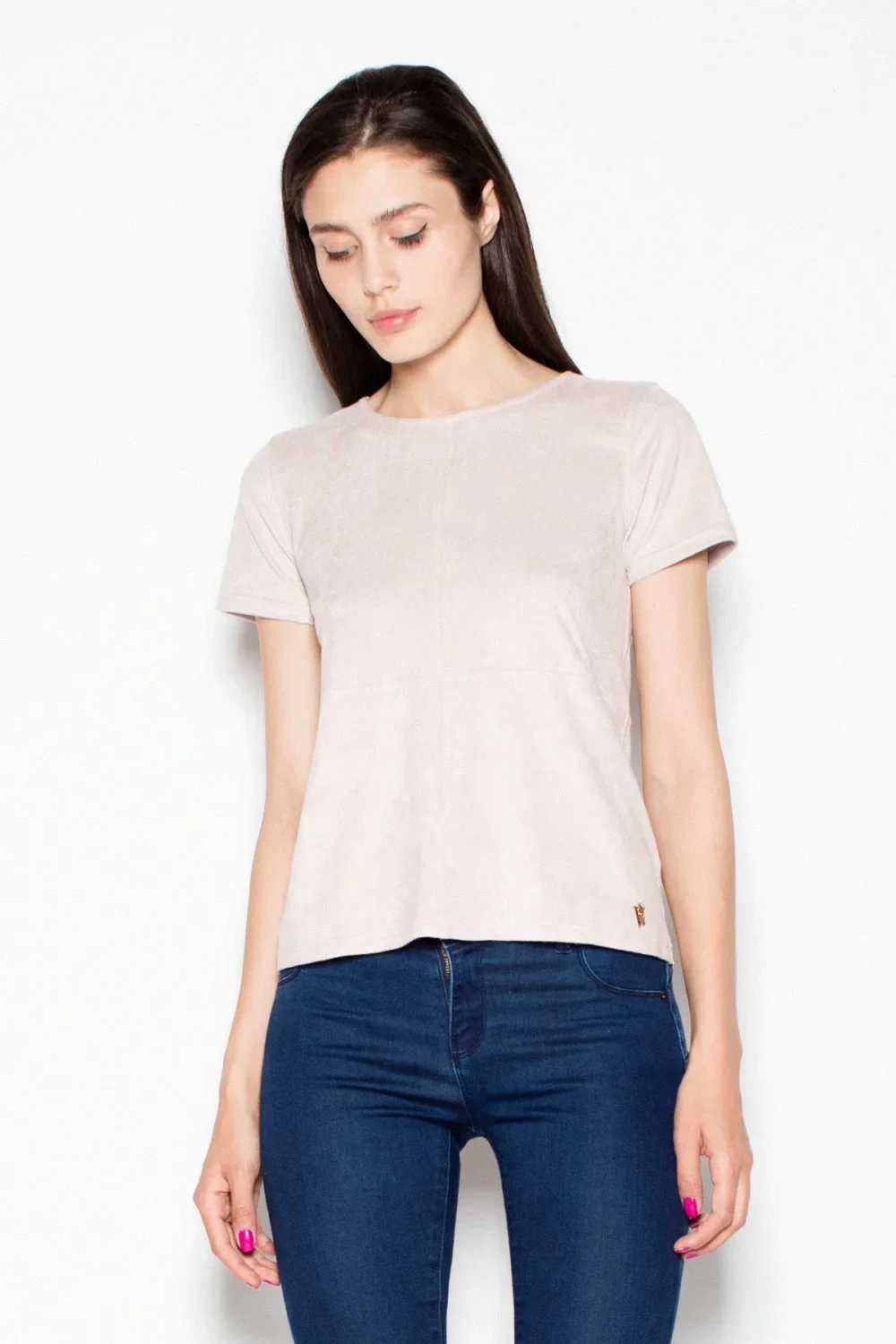 Vzdušná semišová halenka s krátkými rukávy a půlkruhovým výstřihem. Ozdobný zlatý zip na zadní straně. Klasický střih, skvělý pro každodenní nošení.