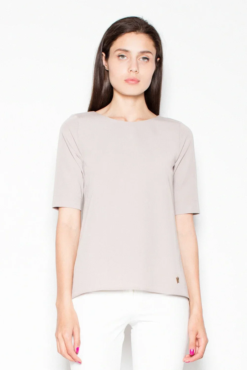 Elegantní halenka s krátkými rukávy a asymetrickým střihem. Na zádech má výřez, který krásně zvýrazňuje záda. Halenka se hodí k odpovídajícím kalhotám.