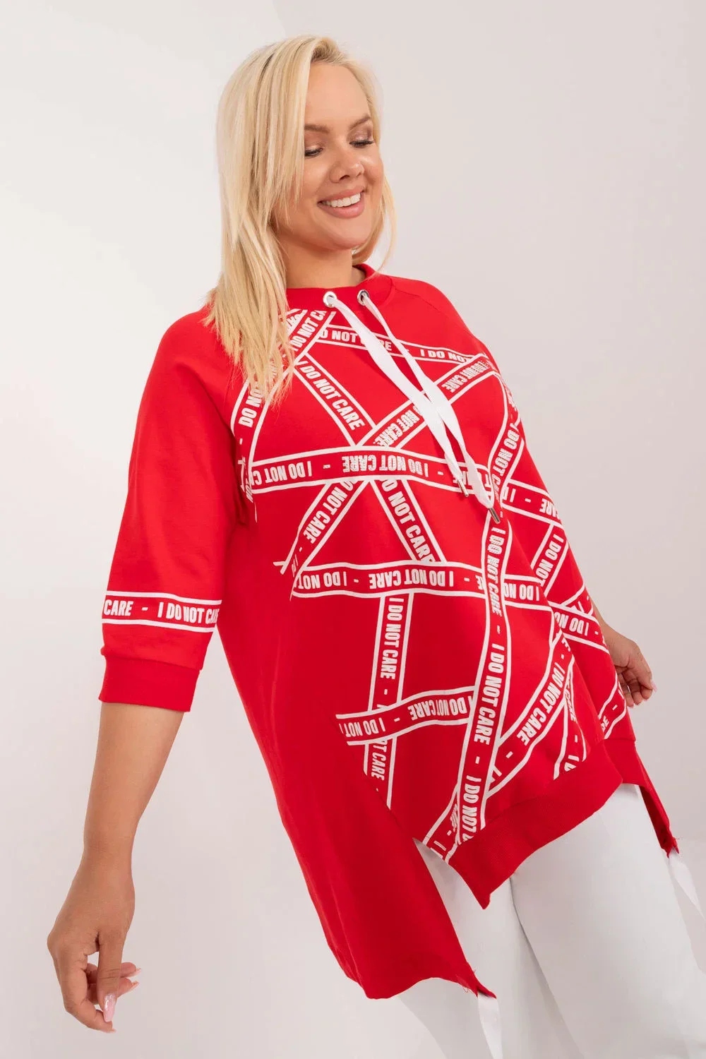 Asymetrická halenka plus size je každodenní kousek s jednoduchým, elegantním střihem, ideální pro každodenní nošení. Je vyrobena z bavlny s přídavkem elastanu, což zaručuje pohodlí a lehký střih. Prodloužený střih a 3/4 rukávy zajišťují volnost pohybu a pohodlí. Halenka má kulatý výstřih, který jí dodává klasický vzhled. Na přední straně je nápis zdobený kamínky, který dodává halence módní a originální charakter. Skvěle se hodí pro každodenní stylizaci, ať už do práce, nebo na běžné vycházky.