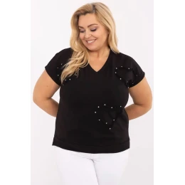Dámská bavlněná halenka plus size v casual stylu je ideální nabídkou na každý den, stejně jako do práce. Vyrobená z příjemné a dotýkavé bavlny s přídavkem elastanu poskytuje pohodlí nošení a skvělé přizpůsobení postavě. Model standardní délky, s krátkým rukávem a ženským V výstřihem, který jemně zdůrazňuje krk. Pozornost přitahuje efektní aplikace vpředu ve tvaru srdcí zdobená třpytivými zirkony, dodává halence elegantní a zároveň jemný šarm. Skvěle se hodí do každodenních outfitů, bude se hodit jak s džínami, tak i s klasickými kalhotami nebo sukní. Univerzální, pohodlná a s charakterem, ideální do práce i na volnější schůzky.