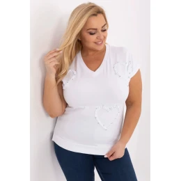 Dámská košile plus size v casual stylu je ideální volbou na každý den i do práce. Vyrobená z příjemné bavlny s přídavkem elastanu zajistí pohodlí a skvělé přizpůsobení postavě. Standardní délka, krátký rukáv a ženský výstřih do srdce jemně zdůrazňující krk. Pozornost upoutá efektní aplikace vpředu ve tvaru srdcí zdobená třpytivými zirkony, dodávající košili elegantní a zároveň jemný půvab. Skvěle se hodí k denním outfitům, bude skvěle vypadat jak s džínami, tak i s klasickými kalhotami nebo sukní. Univerzální, pohodlná a s charakterem, ideální do práce i na volnější setkání.