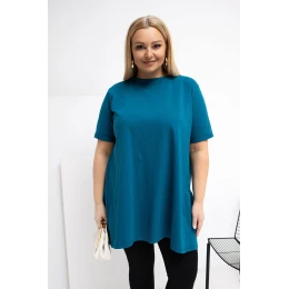 Prodloužený volný top v casual stylu, ideální na každodenní příležitosti. Vyrobený z příjemné bavlny s přídavkem elastanu, díky čemuž je měkký, pružný a pohodlný na nošení po celý den. Hladký vzor způsobuje, že top snadno ladí s mnoha stylizacemi. Model má kulatý výstřih a krátký rukáv, co mu dodává univerzální, volný charakter. Chybějící zapínání zdůrazňuje jednoduchý, pohodlný tvar. Další výhodou je volánka dole vzadu, která jemně ozvláštní střih a přidá mu ženský šarm. Ideální nabídka na každý den k džínům, legínám nebo sukní.
