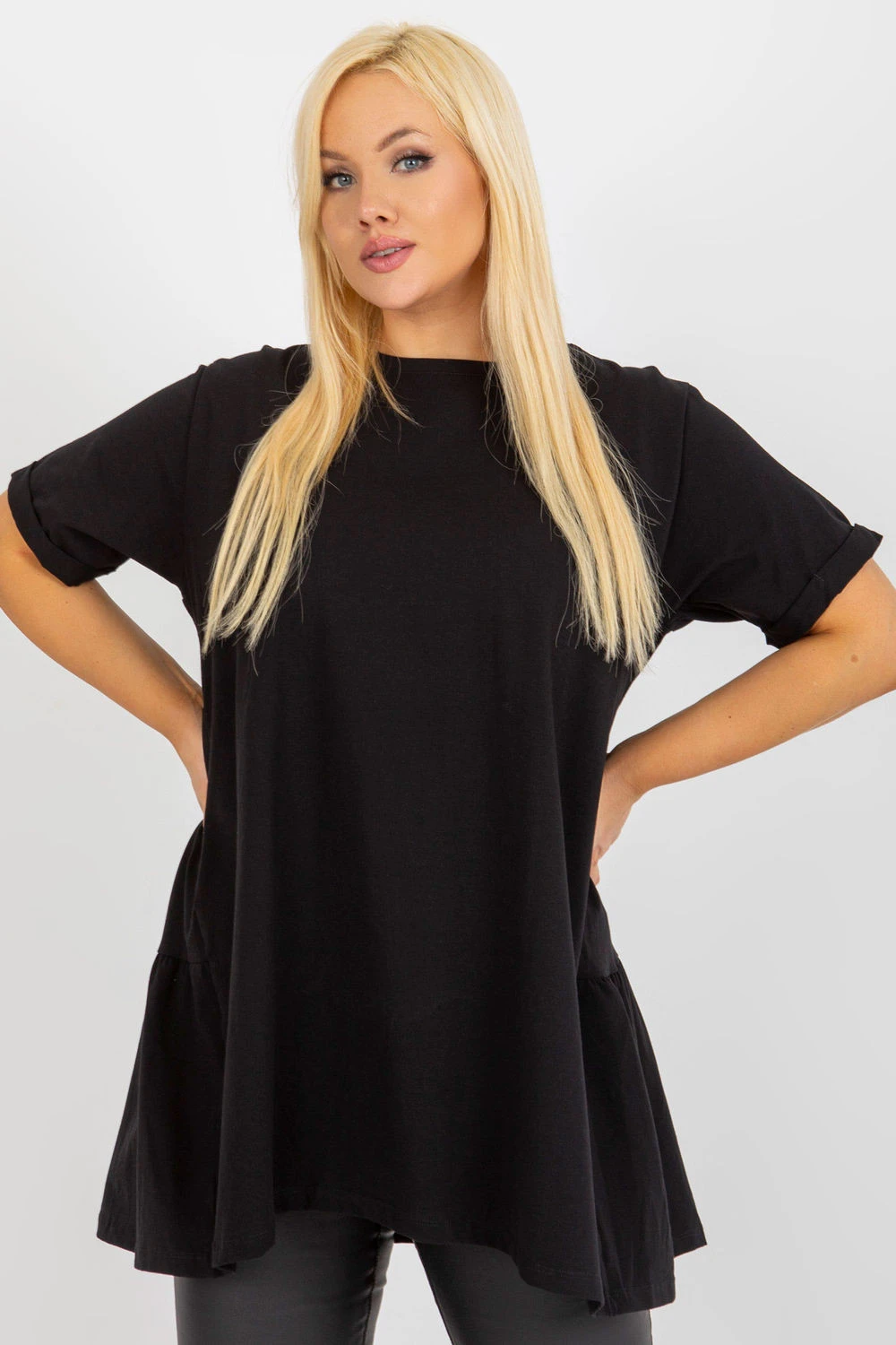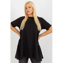 Prodloužený volný top v casual stylu, ideální na každodenní příležitosti. Vyrobený z příjemné bavlny s přídavkem elastanu, díky čemuž je měkký, elastický a pohodlný na nošení po celý den. Hladký vzor umožňuje snadno sladit top s mnoha stylizacemi. Model má kulatý výstřih a krátký rukáv, co mu dodává univerzální a uvolněný charakter. Chybí zapínání, co zdůrazňuje jednoduchý a pohodlný střih. Další výhodou je volánka dole vzadu, která jemně oživuje střih a dodává mu ženský šarm. Ideální volba na každý den k džínům, legínám nebo sukni.