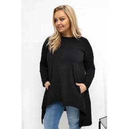 Asymetrická blůza plus size v casual stylu je ideální nabídkou na každý den, kombinující pohodlí s moderním vzhledem. Model s kratším předním a delším zadním dílem jemně zjemňuje postavu a zajišťuje volnost pohybu. Hladký střih činí z blůzy univerzální kousek snadno kombinovatelný, skvěle se hodí jak k džínům, tak k legínám. Vyrobená z vysoce kvalitní bavlny s přídavkem elastanu je měkká, prodyšná a elastická, díky čemuž skvěle padne k postavě. Dlouhý rukáv a klasický, kulatý výstřih zdůrazňují její každodenní charakter. Praktickou výhodou jsou kapsy skryté v bočních švech, které přidávají funkčnost a moderní nádech. Blůza nemá zapínání, což zvyšuje pohodlí nošení a zdůrazňuje její volný, uvolněný styl.