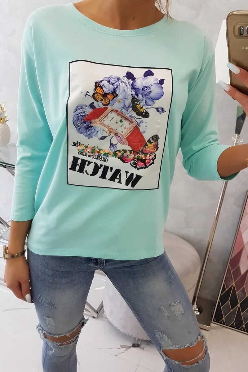 Halenka s 3D grafikou hodinek v mátové barvě