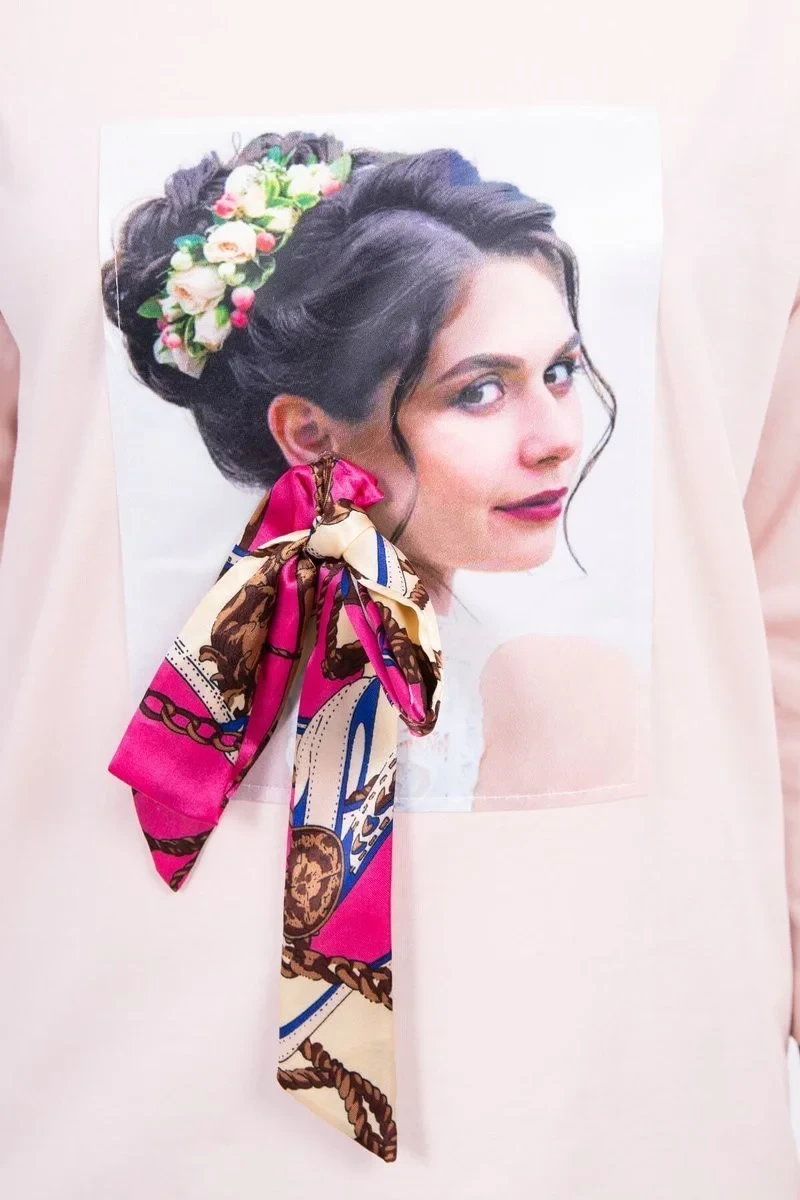 Halenka s grafickou a barevnou 3D mašlí pudrově růžová