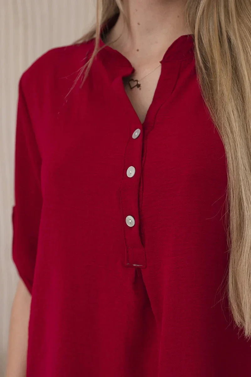 Objevte mimořádnou eleganci a pohodlí v prezentované halence s delšími zády, knoflíkovým výstřihem a ohrnutými rukávy, tato halenka nejen vypadá výjimečně stylově, ale poskytuje také bezkonkurenční funkčnost. Ciťte se sebevědomě a elegantně v halence, která podtrhne váš jedinečný styl. Díky delším zadním dílům vytvoříte jemné a módně nepravidelné proporce a knoflíkový výstřih vám umožní upravit si halenku podle vašich preferencí. Vyhrnuté rukávy dodávají halence lehkost a ležérní charakter, ideální pro různé příležitosti. Ať už se jedná o obchodní jednání nebo relaxační kávu s přáteli, naše halenka vám poskytne pohodlí a styl v jednom. Nenechte si ujít příležitost přidat do svého šatníku tuto jedinečnou halenku! Objevte eleganci, pohodlí a funkčnost v jednom a zdůrazněte svůj jedinečný styl ještě dnes. Velikost je univerzální a bude vhodná pro ženy, které nosí velikost S, M nebo L.