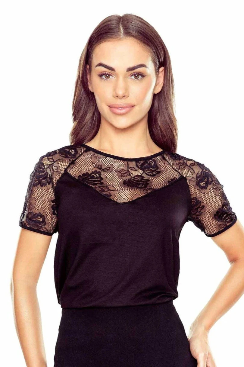 Bluzka Ursa z krótkim rękawem to elegancka propozycja dla kobiet, które cenią klasyczny styl wzbogacony efektownymi, kobiecymi detalami. Model został wykonany z miękkiej, elastycznej wiskozy, dzięki czemu doskonale dopasowuje się do sylwetki, zapewniając komfort noszenia oraz swobodę ruchów przez cały dzień. Klasyczny okrągły dekolt zyskuje wyjątkowy charakter dzięki efektownej koronce o kwiatowym princie, która zdobi zarówno dekolt, jak i krótkie rękawy. Delikatna, półtransparentna koronka subtelnie eksponuje górną część sylwetki, dodając bluzce elegancji i lekkości. Model Ursa idealnie sprawdzi się w stylizacjach biurowych, na uroczystości rodzinne, kolacje czy wieczorne wyjścia. To ponadczasowa bluzka damska, którą z łatwością zestawisz ze spódnicą, eleganckimi spodniami lub marynarką.