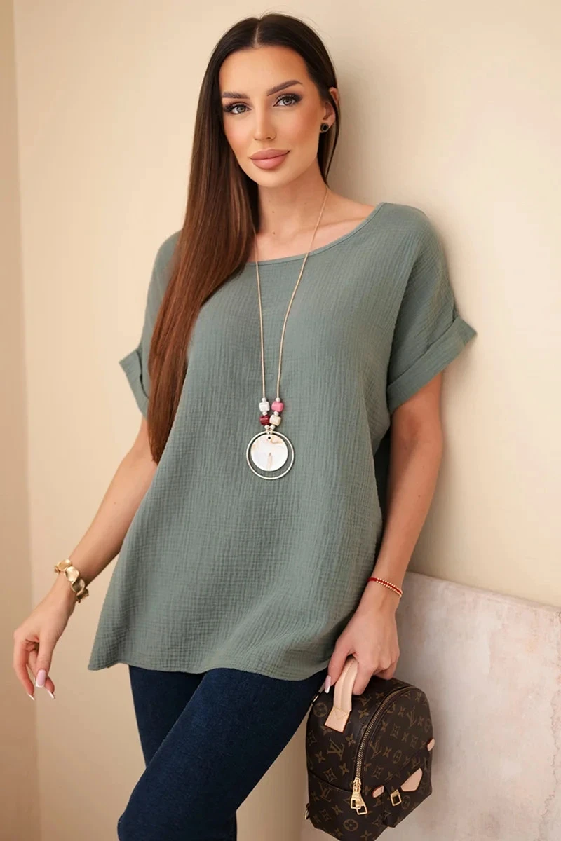 Hedvábná blůza s náhrdelníkem tmavě khaki