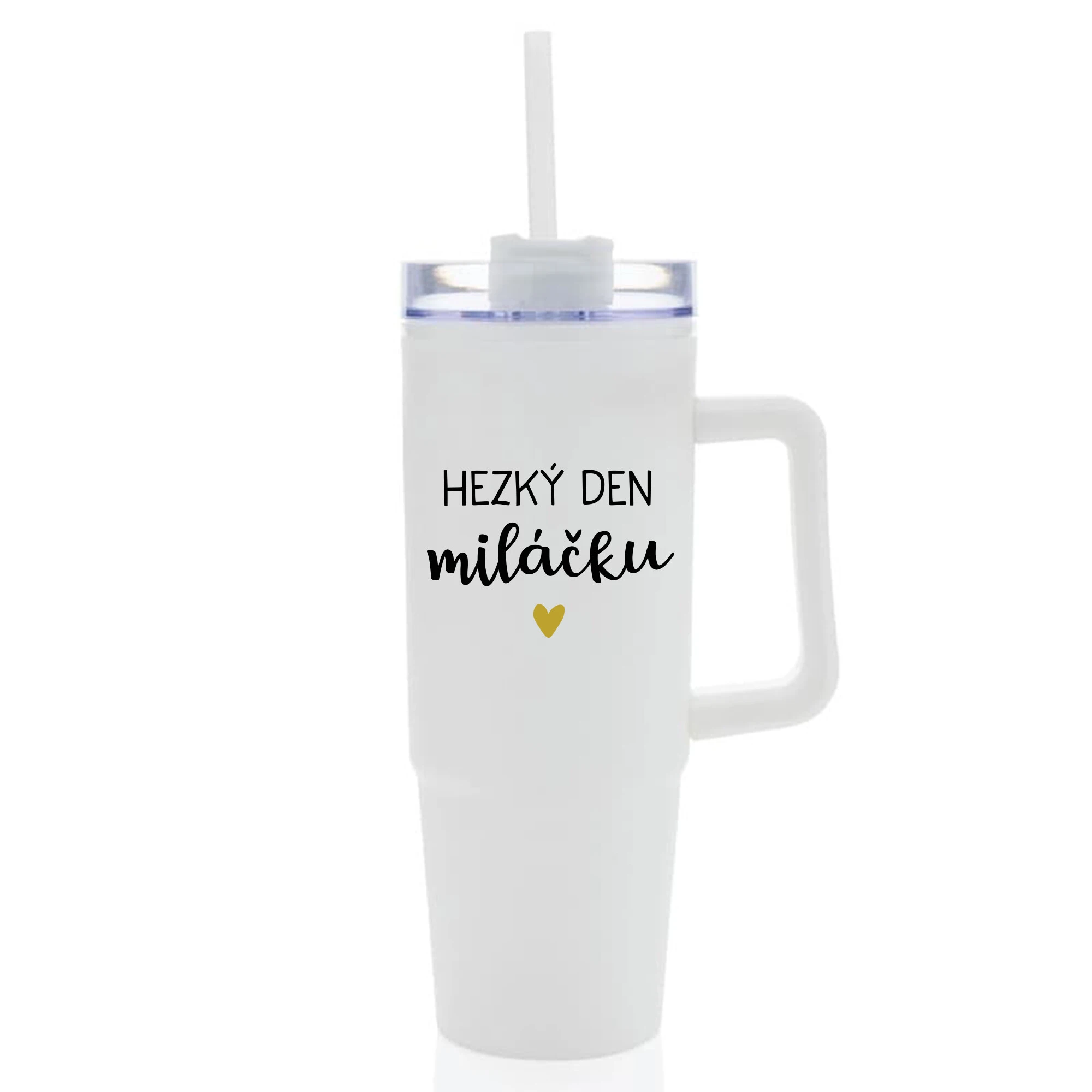 HEZKÝ DEN MILÁČKU - bílý cestovní termohrnek s průhledným víčkem 900 ml