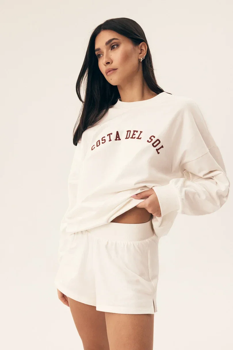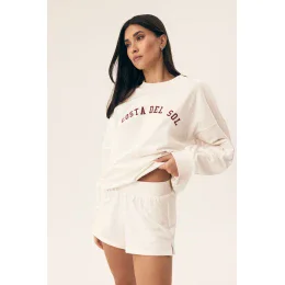 Bawełniana piżama damska idealna również jako homewear, sportowy fason, bluza z długim rękawem, dekolt okrągły, z przodu ozdobny haftowany napis, do kompletu krótkie spodenki, mankiety, dół koszulki i pas wykończone ściągac.