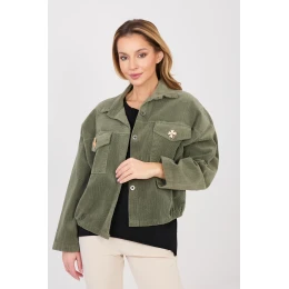 Moderní dámská sametová bunda ve stylu casual, ideální na každodenní přechodné dny. Tento model kombinuje klasický střih bomberky s moderním, lehce retro zpracováním, vytvářející univerzální nabídku pro různé styly. Bunda je vyrobena z vysoce kvalitní bavlny s přídavkem elastanu, co zajišťuje pohodlí nošení a jemnou pružnost materiálu. Má hladký vzor, krátký střih a dlouhý rukáv, který dodává lehkost a moderní charakter. Praktické kapsy na přední straně umožňují pohodlné ukládání drobností, a zapínání na knoflíky a elastický lem na spodní části zajišťují přizpůsobení a pohodlí nošení. Další výhodou jsou odnímatelné ozdobné brože, které umožňují personalizovat vzhled bundy. Model je dokončen klasickým límcem, co zdůrazňuje elegantní charakter bomberky, zatímco zachovává pohodlný, ležérní styl. Je to ideální volba pro ženy, které hledají praktickou a zároveň stylovou bundu na jaro nebo podzim.