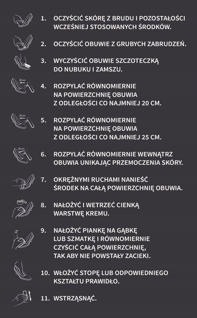 2. Nastříkejte rovnoměrně na obuv ze vzdálenosti nejméně 25 cm. Nepoužívejte na paty.