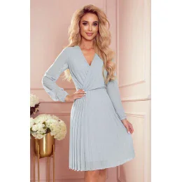 ISABELLE - Šedé dámské plisované šaty s dekoltem a dlouhými rukávy 313-11