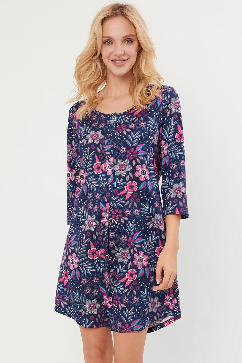 Noční košile značky Italian Fashion. 3/4 velikost Lidový model. Výrobek je vyroben ze 100% bavlny. Místo zapínání: vpředu. Noční košile se zapíná na patentky. Délka rukávů: 3/4. Délka: midi. Dámský výrobek. Typ výstřihu: kulatý.