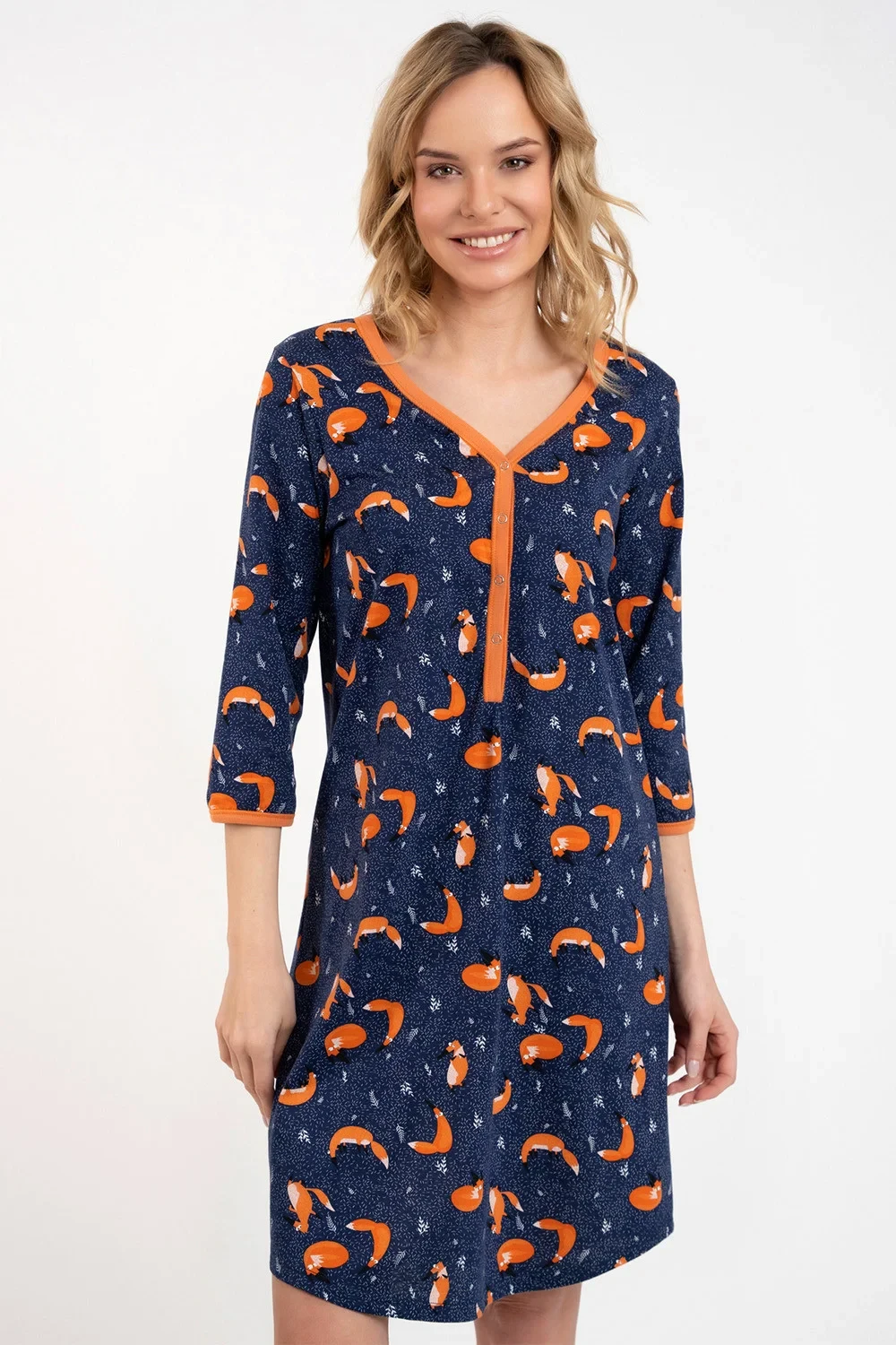Noční košile značky Italian Fashion. 3/4 velikost modelu Wasilla. Výrobek je vyroben ze 100% bavlny. Těhotenské oblečení. Místo zapínání: vpředu. Noční košile se zapíná na patentky. Délka rukávů: 3/4. Délka: midi. Dámské oblečení. Typ výstřihu: výstřih do V.