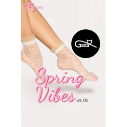 Gatta Spring Vibes wz. 06 to wyjątkowe skarpetki 15 den, które łączą klasyczną subtelność z delikatnym błyskiem. Transparentna tkanina ozdobiona drobnymi, regularnymi kropeczkami i eleganckim, metalizowanym ściągaczem sprawia, że ten model jest idealnym dodatkiem zarówno do codziennych, jak i bardziej wyszukanych stylizacji. Wysoka zawartość elastanu gwarantuje elastyczność i komfort noszenia, a metalizowane włókno dodaje całości wyjątkowego uroku. To doskonały wybór dla kobiet, które cenią detale i modową świeżość.