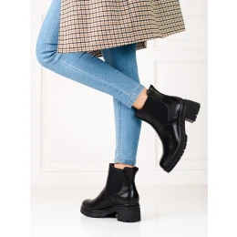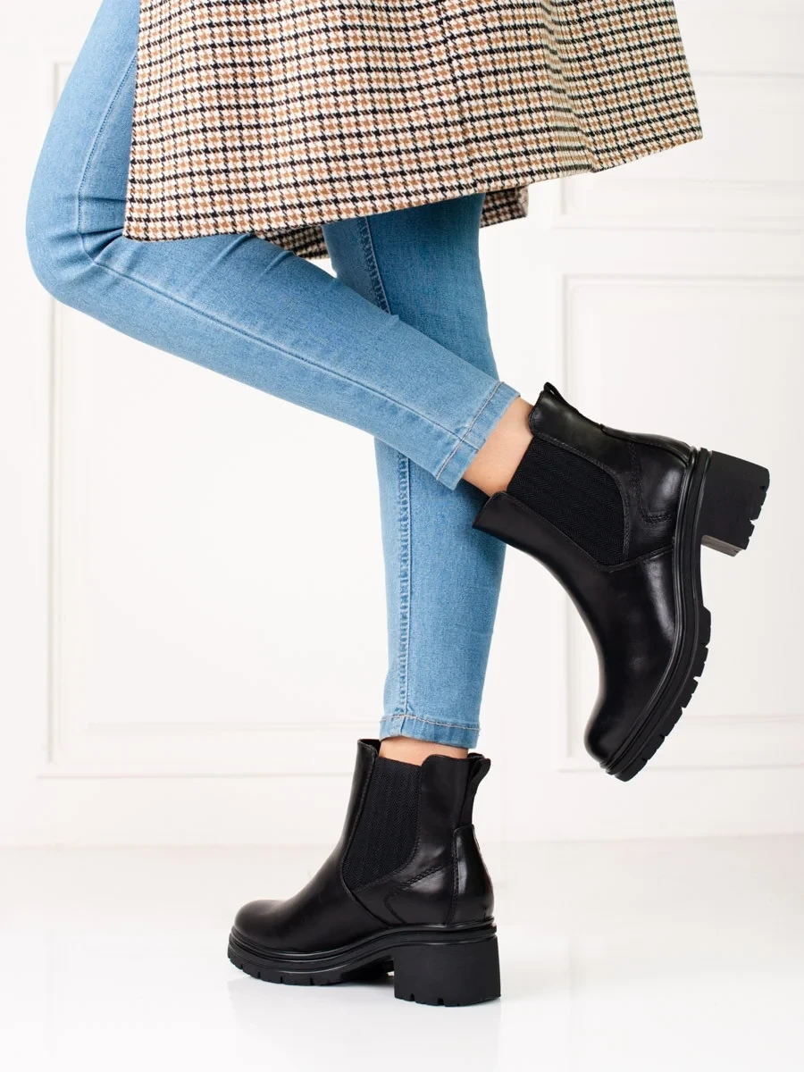Jedinečné černé dámské kotníčkové boty na širokém podpatku