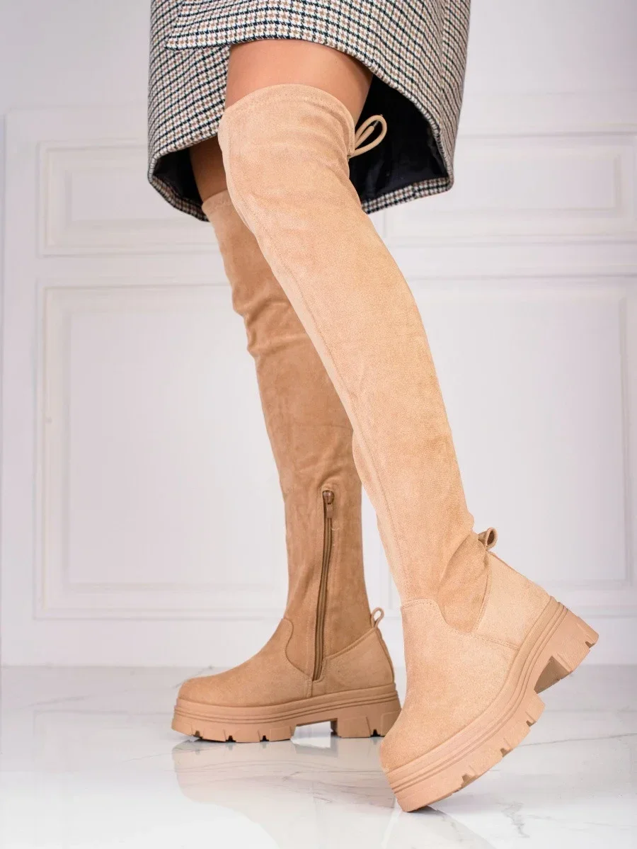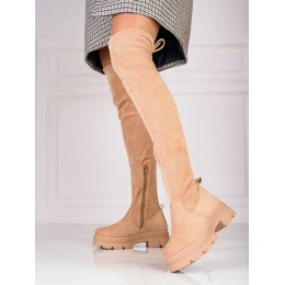 Jedinečné dámské kozačky hnědé na širokém podpatku
