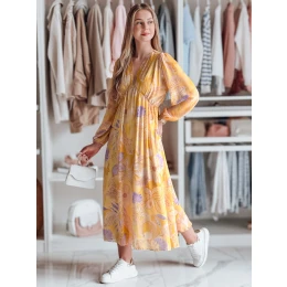 Dámské šaty s lehkou konstrukcí a ozdobným vzorem, určené pro pohodlné nošení a volně splývající látku. Obálkový výstřih organizuje horní část siluety a dodává celku ucelené proporce. Díky midi délce si střih zachovává univerzální charakter. Model kombinuje jemnost látky s funkčním střihem.