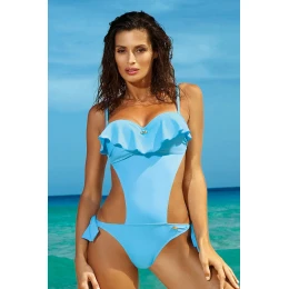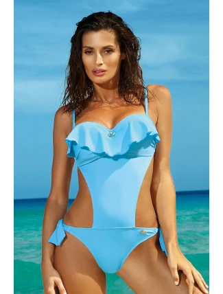 Velmi sexy jednodílné plavky monokiny s brazilskými zády. Hladké, s malou zlatou mašlí s drahokamy ve výstřihu a koketním volánkem v nejmódnějším kubánském stylu. Ženský, jemný, smyslný... Přivítejte jeden z nejžhavějších modelů sezóny! Košíčky s podvazky, vyztužené, s trvale umístěnou neodnímatelnou push-up výplní - skvěle modelují prsa, zvedají je a opticky zvětšují. Ramínka bez ramínek jsou plně odnímatelná, skvělá pro rovnoměrné opálení dekoltu a ramen. Obvod se zapíná sponou. Spodní část plavek se na bocích pohodlně zavazuje. Zadní část je mírně vykrojená, aby odhalovala hýždě (brazilský typ). Pokud chcete, můžete si vzít pareo a pohodlně se procházet po pláži. Model je vyroben z italské elastické tkaniny. Nejnovější kolekce Léto 2018.