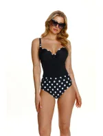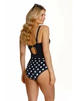 Jednodílné plavky z úpletu v černé a bílé barvě hrášku, ideální na pláž i do bazénu. Střih plavek kombinuje funkčnost a eleganci. Plavky mají všitou podprsenku s vyztuženými push-up košíčky a nastavitelná, neodnímatelná ramínka. Kalhotková část je vyrobena z úpletu s tečkovaným vzorem. Zadní díl plavek se zapíná na přezku.