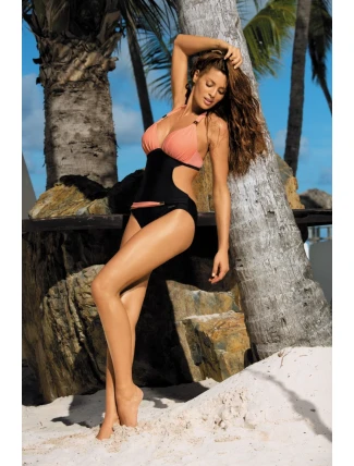 Elegantní jednodílné plavky monokiny s košíčky tvarujícími prsa. Horní díl plavek je spojen se spodním dílem pěkně střiženým širším páskem, který zakrývá bříško. Zadní díl plavek vypadá jako dvoudílný a zapíná se vzadu na přezku. Košíčky jsou vyztužené měkkou pěnou a ve spodní části vyztužené, což prsa zvedá a opticky zvětšuje. Podprsenky na bocích. Řemínky zavazované na krku, zdobené broží ve stříbrné barvě. Pásek na bocích, rovněž s broží. Dvě barvy (které k sobě dokonale ladí) vypadají svěže, moderně a svátečně. Ideální na pláž. Jednodílné plavky, tzv. monokiny. < Rychleschnoucí, odolný vůči slunci (nebledne).