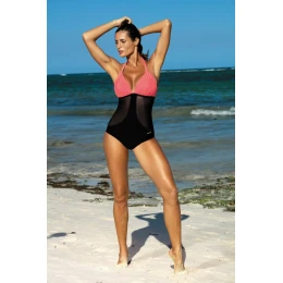 Senzační jednodílné plavky s tylovými boky. V této sezóně velmi módní. Mírně zakrývá bříško, ale přesto vám umožní vypadat výjimečně krásně. Konstrukce horní části (košíčků) byla profesionálně vymodelována - z malých a středních prsou vytváří něco opravdu výjimečného. Košíčky jsou vyztužené speciální pěnou a mají zabudovaný push-up, který prsa nadzvedne, přiblíží je k dekoltu a svůdně je zvětší. Push up nelze z modelu vyjmout. Ramínka se zavazují na krku a jsou zdobena elegantní broží. Obvod je elastický, na zádech se pohodlně zapíná přezkou. Zde jsou velmi módní, moderní jednodílné plavky push up monokiny. Rozhodně doporučujeme!