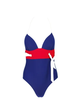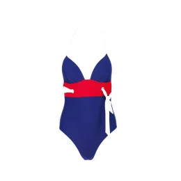 Jednodílné italské dámské plavky modro-červeno-bílé, se štrausovými kamínky, košíčky vyztužené, bez kostic, zavazování za krkem.