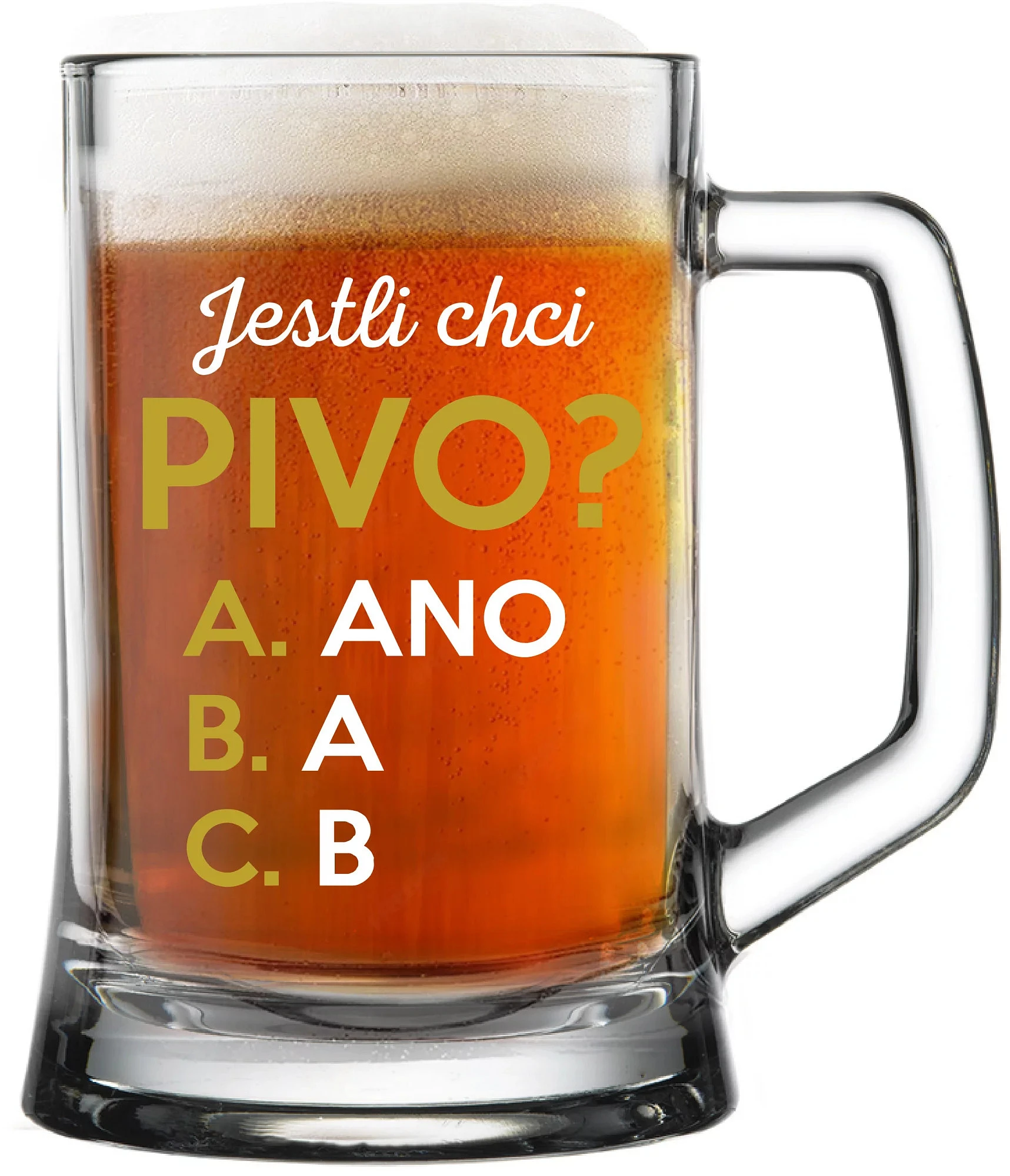 Hledáte dokonalý dárek pro milovníky piva? Naše pivní sklenice jsou přesně to, co potřebujete! Každá sklenice je vyrobena z prvotřídního skla, které zaručuje dlouhodobou odolnost a čistotu. S objemem 0,5 litru jsou tyto sklenice ideální pro vychutnávání oblíbeného zlatavého moku. Ale to nejlepší na nich je jedinečný vtipný nápis: JESTLI CHCI PIVO?, který osloví každého pivaře. Ať už jde o pohodový večer s přáteli nebo relaxační chvíle u oblíbeného seriálu, tyto sklenice dodají každé příležitosti špetku humoru. Nenechte si ujít příležitost udělat radost sobě nebo svým blízkým tímto vtipným a praktickým dárkem. Objednejte si nyní a užívejte si pivo s úsměvem! Doporučujeme ruční mytí tohoto produktu pro zachování jeho kvality a trvanlivosti. Nedoporučujeme umisťovat do myčky na nádobí.