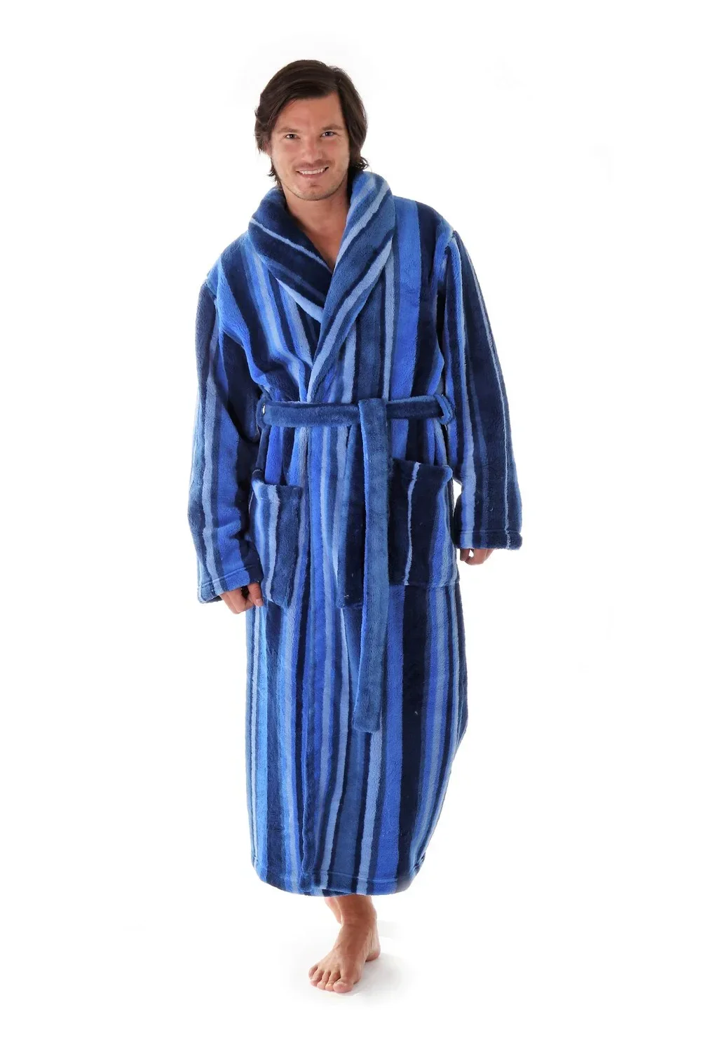 Dlouhý hřejivý pánský župan pro aktivní muže. Svěží modrá spolu s nestárnoucími pruhy se v této kombinaci vyjímá na materiálu wellsoft s hustým vlasem, který je nejen báječně hřejivý, ale také velmi příjemný na omak. Pohodlný střih se šálovým límcem zajišťuje komfort při nošení. Kombinace svěžích odstínů modré v nadčasovém vzoru pro všechny věkové skupiny.