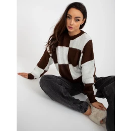 Hnědobílý volný klasický svetr ve čtvercích .
