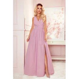 JUSTINE - Dlouhé dámské šaty v pudrově růžové barvě s výstřihem a zavazováním 362-3