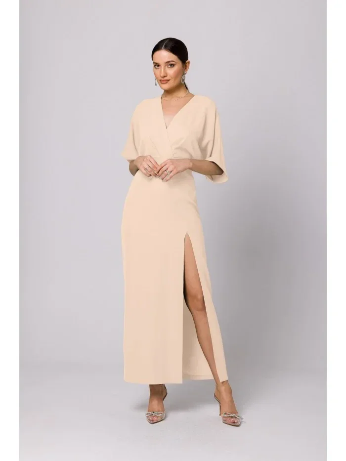 95% polyester 5% elastan Milujeme dlouhou siluetu, vysoký rozštěp na nohou a kimonový design těchto maxi šatů. PODROBNOSTI O PRODUKTU: maxi šaty z tkané látky s vysokým rozštěpem na nohou výstřih do V kimonový vršek krátké rukávy skrytý boční zip bez podšívky Naše modelka je vysoká 175 cm a nosí velikost S