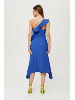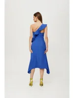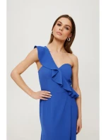 464-1 Plisované šaty s výstřihem a volánky na ramenou - MODRÉ SE SVĚTLÝMI RŮŽEMI