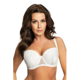 Elegantní vyztužená podprsenka typu balconette v jemné krémové barvě. Košíčky, vyztužené měkkou pěnou, se skládají ze tří částí spojených dvěma svislými švy, maskovanými saténovým lemováním. Střední část košíčků a střed podprsenky zdobí krásná elastická krajka imitující pruhovanou aplikaci Tvar košíčků odhaluje dekolt a dokonale podpírá prsa, která získávají plný, zaoblený tvar. Horní linie košíčků je zakončena ozdobným úzkým saténovým páskem. Uvnitř košíčků je kapsa na push-up vložky. Půvabná mašle mezi šálky. Boky jsou vyrobeny ze silného, pružného úpletu Lycra, vyztuženého – ve všech velikostech - s bočními svislými velrybími kostmi.